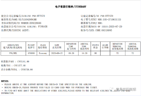 出境前準(zhǔn)備工作井然有序的進(jìn)行著,接下來就是購(gòu)買機(jī)票,定下出行日期了。自全球疫情爆發(fā)以來,國(guó)際機(jī)票價(jià)格飛漲,甚至一票難求。中國(guó)到芬蘭的機(jī)票也是同樣如此,雖然目前的航班比之前有所增加,但是依然是班次少,價(jià)格高,搶票難。就是在這樣的情況下,公司還是想辦法幫助廚師購(gòu)買到了出行時(shí)間合適,價(jià)格遠(yuǎn)低于市面的機(jī)票。考慮到疫情期間盡量減少在旅途中接觸風(fēng)險(xiǎn),所以幫助廚師購(gòu)買了直飛芬蘭的航班。