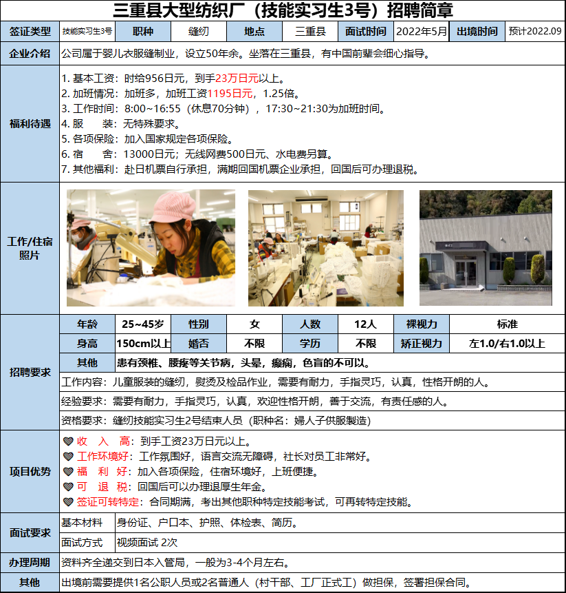 要求縫紉技能實(shí)習(xí)生2號(hào)結(jié)束人員,主要負(fù)責(zé)兒童服裝的縫紉,熨燙及檢品作業(yè),到手工資23萬(wàn)日元以上。需要有耐力,手指靈巧,認(rèn)真,性格開(kāi)朗的人。