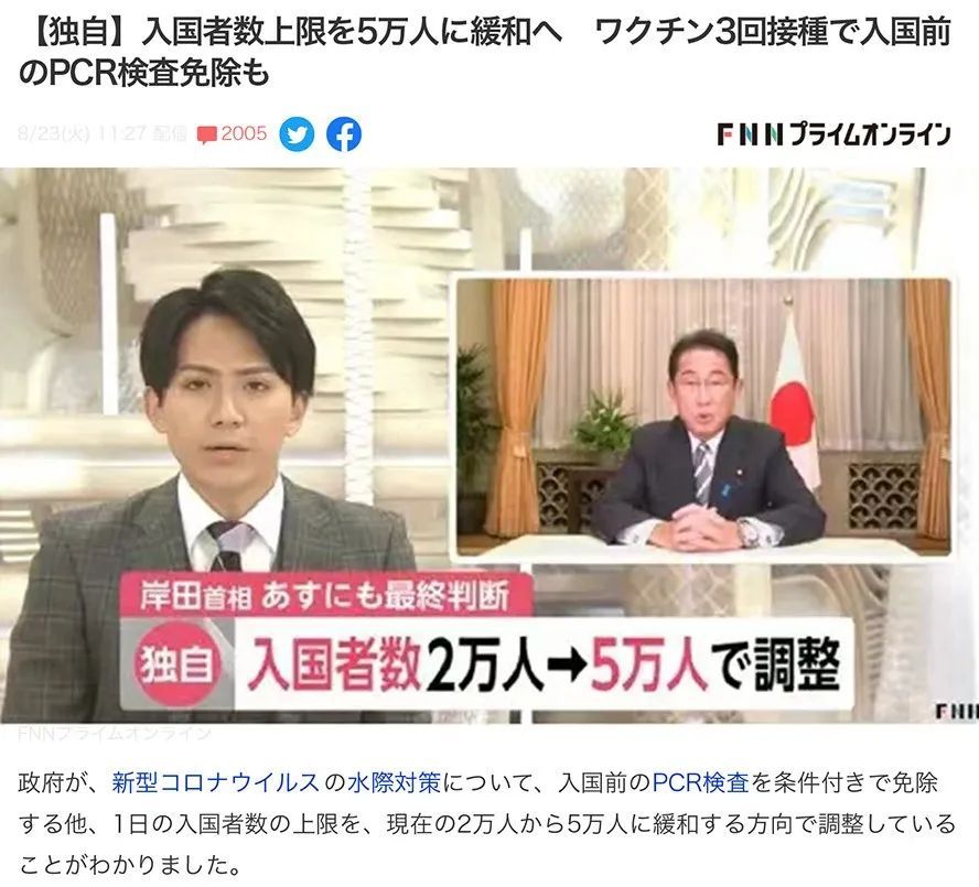 2022年8月23日,日媒NHK報(bào)道,日本政府計(jì)劃將每日入境人數(shù)上限由原來(lái)的2萬(wàn)人提升到5萬(wàn)人。