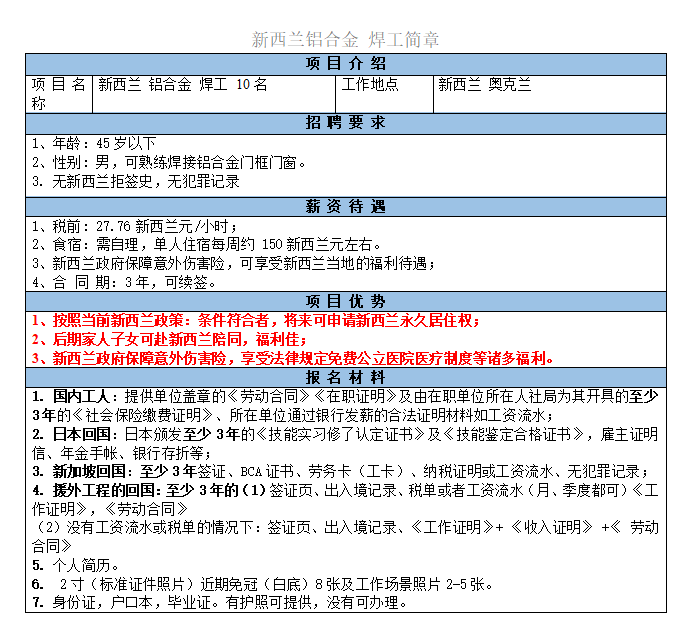 稅前: 27.76新西蘭元/小時(shí);要求45歲以下男性、可熟練焊接鋁合金門框門窗。