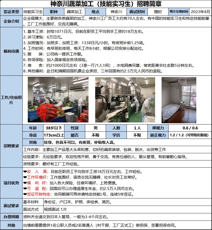 本會(huì)社主要是做蔬菜加工,具體工作內(nèi)容有切蔬菜,裝箱,裝卸車(chē),會(huì)修機(jī)器更好。需要性格開(kāi)朗,日語(yǔ)學(xué)習(xí)能力強(qiáng),有耐力,患有頸椎、腰疼等關(guān)節(jié)病,慢性病的不可以。