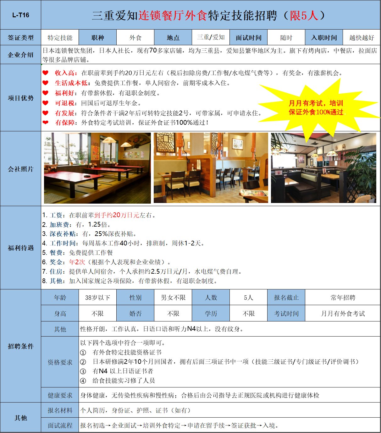 主要負責前廳服務和后廚幫廚(煮面,洗菜、配菜、清洗餐具)。免費提供工作餐,有獎金,有漲薪機會。回國后可退厚生年金。符合條件者干滿2年后可轉(zhuǎn)特定技能2號,可帶家屬,可申請永住。