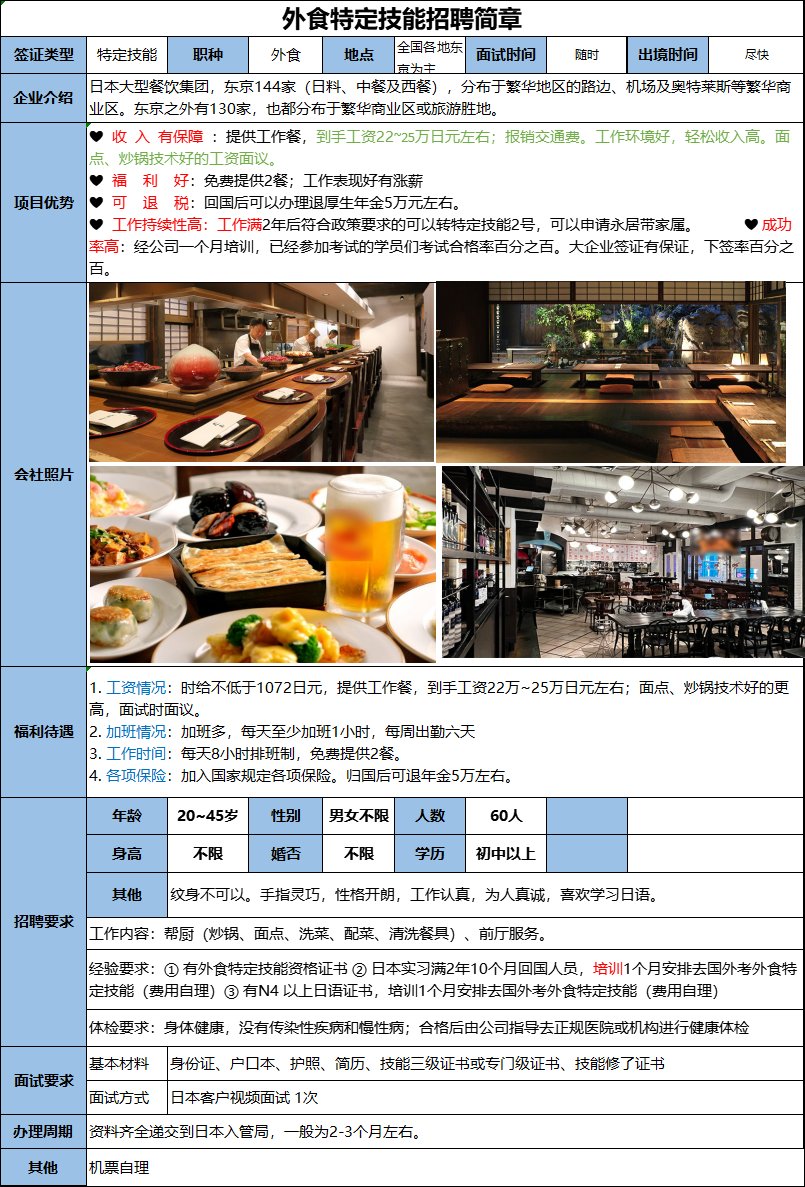 主要負(fù)責(zé)前廳服務(wù)和后廚幫廚(煮面,洗菜、配菜、清洗餐具)。免費(fèi)提供工作餐,有獎金,有漲薪機(jī)會?;貒罂赏撕裆杲?。符合條件者干滿2年后可轉(zhuǎn)特定技能2號,可帶家屬,可申請永住。