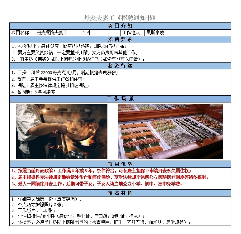男方主要負責日料制作、女方負責壽司等其他廚房事務,男方會一點英語最佳;稅后22000丹麥克朗/月,后期根據(jù)表現(xiàn)漲薪