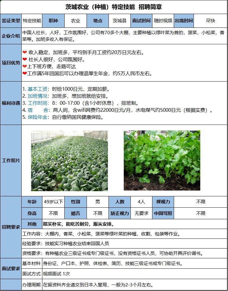 主要在大棚內(nèi)種植茄子,淡季時可以申請回國探親。 收入高,有25%加班費,目前在職前輩平均到手工資約20萬日元左右。