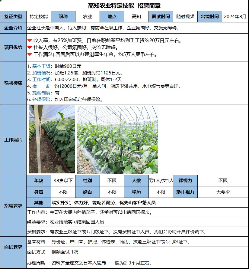 主要在大棚內(nèi)種植茄子,淡季時(shí)可以申請(qǐng)回國探親。 收入高,有25%加班費(fèi),目前在職前輩平均到手工資約20萬日元左右。