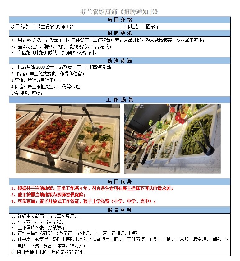 芬蘭高薪項(xiàng)目:包吃住,包水電,住宿地點(diǎn)離餐廳步行十分鐘,月薪2400歐(接近1.7w人民幣)純凈到手收入,要求40歲以下踏實(shí)樸實(shí)的師傅,不限地域不限菜系。