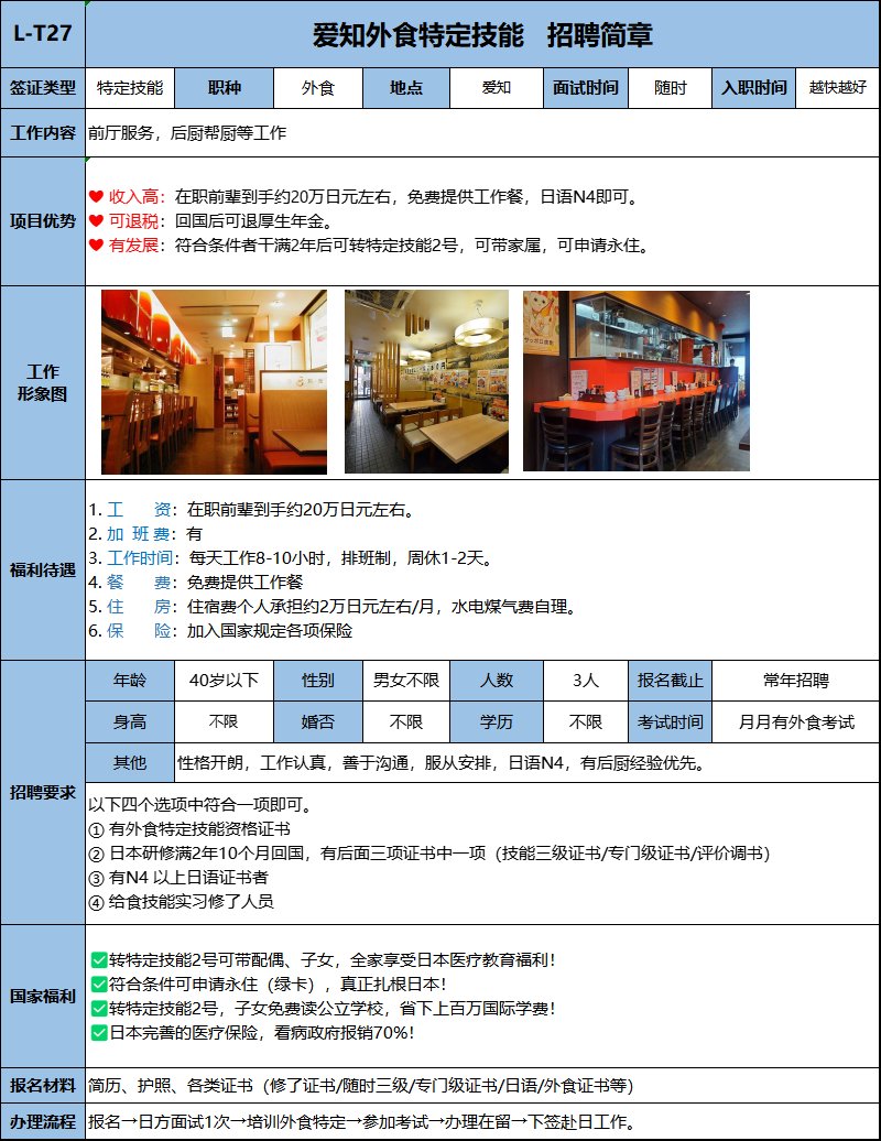 主要負(fù)責(zé)前廳服務(wù)和后廚幫廚(煮面,洗菜、配菜、清洗餐具)。免費(fèi)提供工作餐,有獎(jiǎng)金,有漲薪機(jī)會(huì)?;貒?guó)后可退厚生年金。符合條件者干滿2年后可轉(zhuǎn)特定技能2號(hào),可帶家屬,可申請(qǐng)永住。