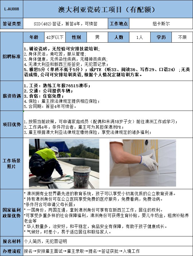實(shí)力公司,主營(yíng)家居建材,主要負(fù)責(zé)鋪設(shè)瓷磚、地板,1年以上相關(guān)工作經(jīng)驗(yàn);年薪73150澳幣,多勞多得,工資漲薪潛力極大