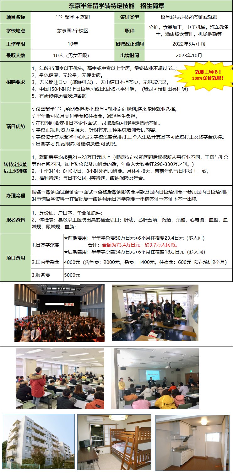 東京半年留學(xué)轉(zhuǎn)特定技能,半年后可就職!就職工種多!100%保證就職!