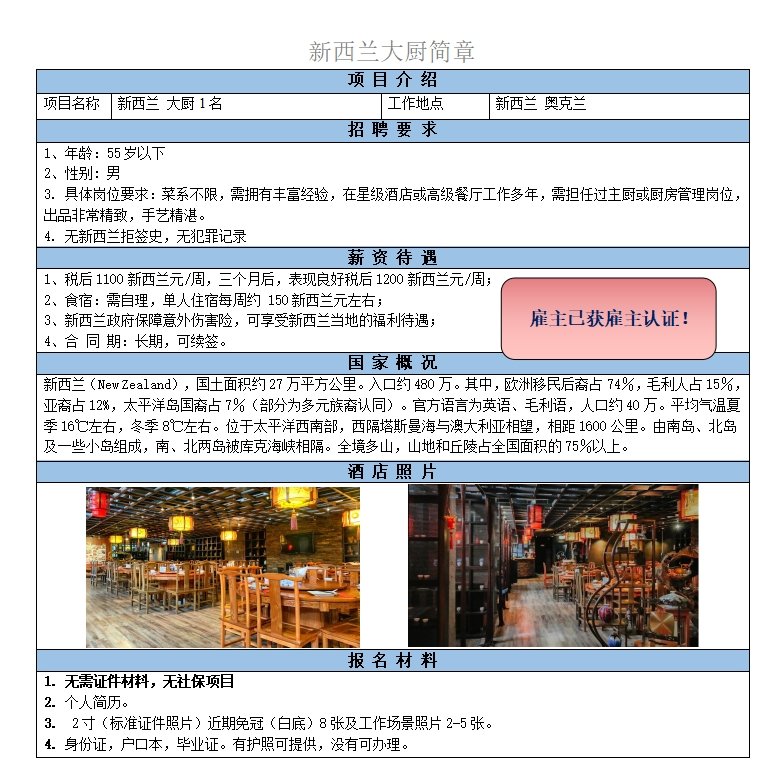 菜系不限,需要有真實的廚師經(jīng)驗,切配炒鍋嫻熟。稅后950新西蘭元/周,如后期表現(xiàn)良好,可加薪;