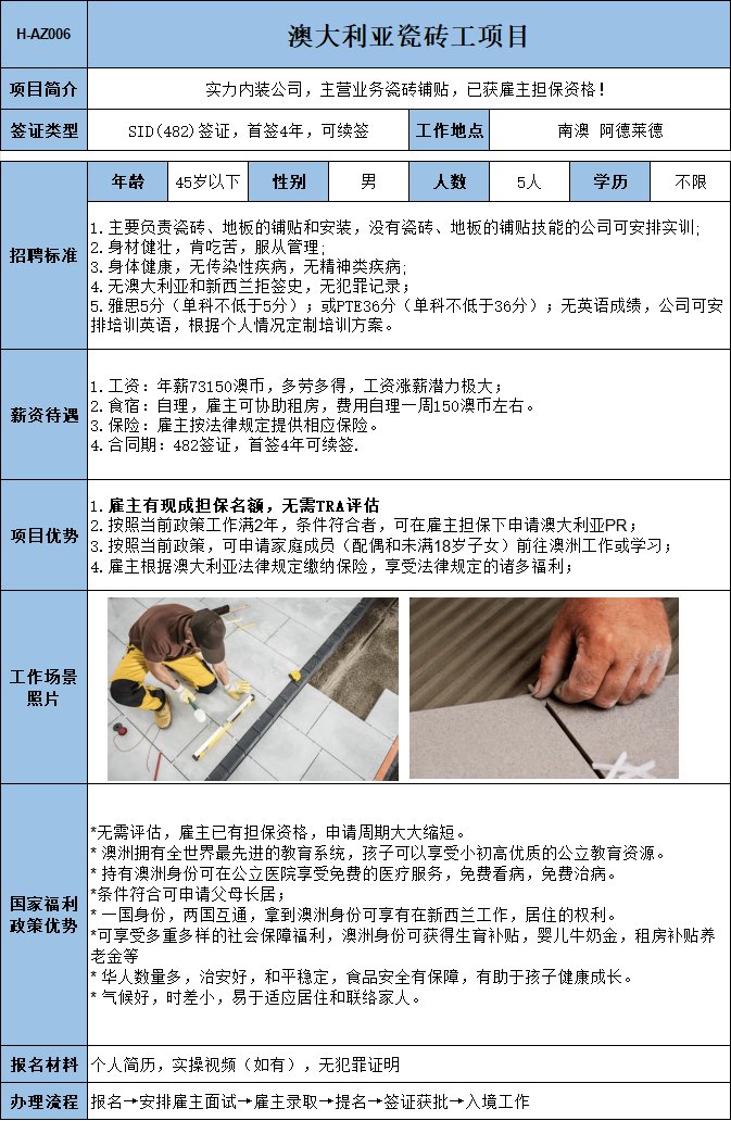 實(shí)力內(nèi)裝公司,主營業(yè)務(wù)瓷磚鋪貼,已獲雇主擔(dān)保資格!年薪73150澳幣,多勞多得,工資漲薪潛力極大
