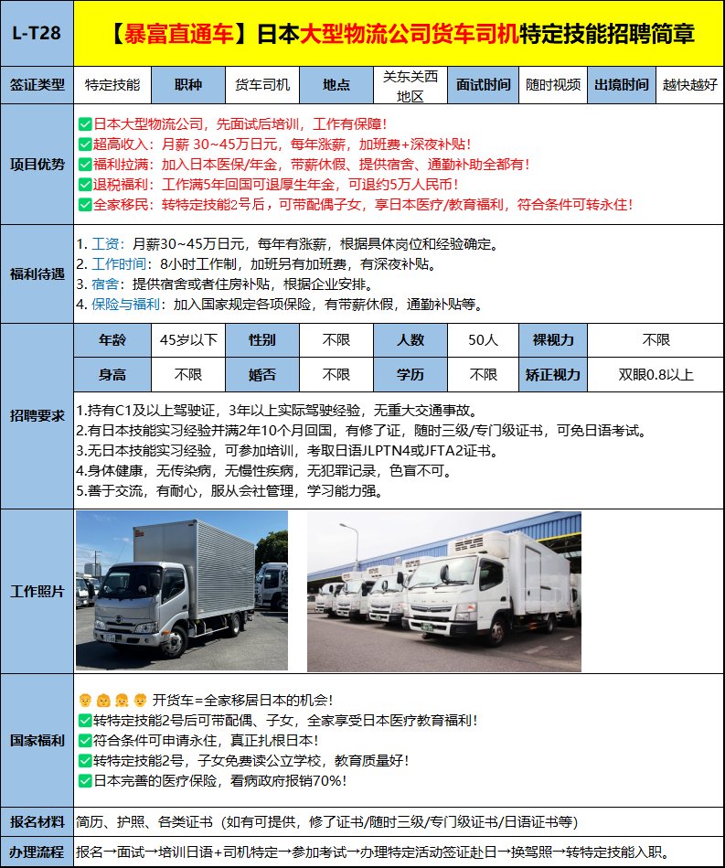 報(bào)名→書(shū)類(lèi)選考→培訓(xùn)日語(yǔ)+司機(jī)特定→參加考試→面試→辦理特定活動(dòng)簽證赴日→換駕照→轉(zhuǎn)特定技能