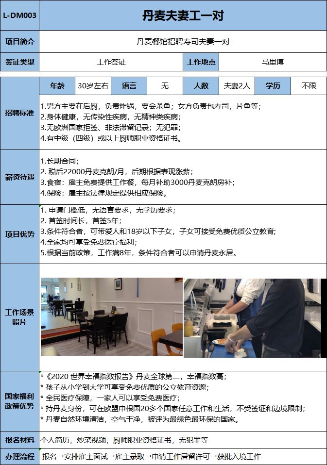 丹麥超高薪夫妻項目來咯!28000丹麥克朗包吃住,餐廳規(guī)模大,值得信賴。目前需要兩對夫妻,若單人申請也可考慮。