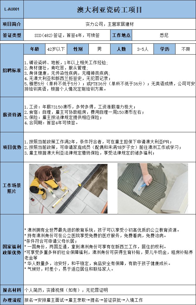 實(shí)力公司,主營(yíng)家居建材,主要負(fù)責(zé)鋪設(shè)瓷磚、地板,1年以上相關(guān)工作經(jīng)驗(yàn);年薪73150澳幣,多勞多得,工資漲薪潛力極大