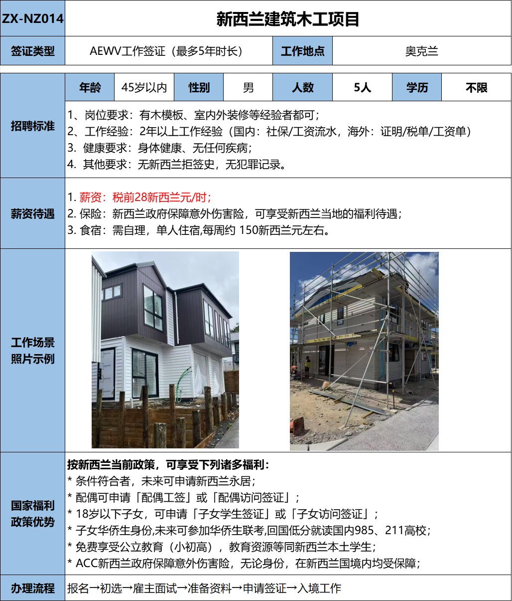 要求會熟練完成建筑木工工作,工作態(tài)度勤懇,服從指揮,稅前27.76新西蘭元/小時