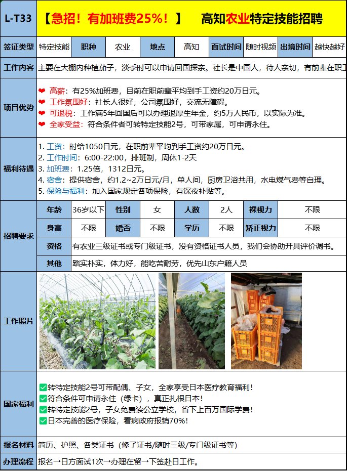 主要在大棚內(nèi)種植茄子,淡季時可以申請回國探親。 收入高,有25%加班費,目前在職前輩平均到手工資約20萬日元左右。